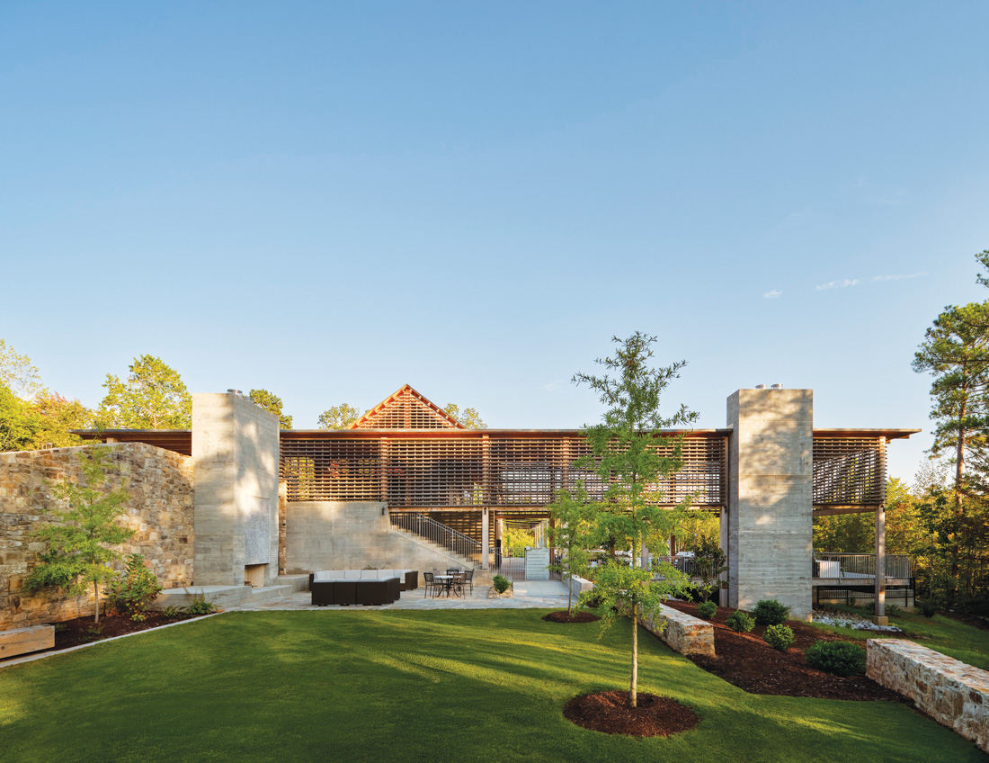 When South Street Partners tasked Keith Summerour of Atlanta-based firm Summerour Architects with designing a new Sports Pavilion for The Cliffs at Mountain Park, Summerour drew inspiration from the region’s history. “Because of the hills and steepness in the Upstate, farms here tend to be smaller and the settlers’ barns not as large as elsewhere in South Carolina. We modeled the Sports Pavilion on that scale, a building that feels agrarian but approachable, with a cleverness in the use of materials associated with a barn,” Summerour says. “We wanted it as open-air as possible, so when you enter through a tall one-story portal, it looks like a foyer without doors, like a deconstructed barn or house.” There are openings where windows would go, but no windows—it’s all open air. Horizontal slats form the entranceway, and those deconstructed columns do double duty as lighting in the evening. “We placed garden lights inside the columns, and when the light hits the slats, it spills out to the surrounding area,” he adds. “The result is an interesting, romantic reflection in the water, which makes it feel different at night than during the day.”